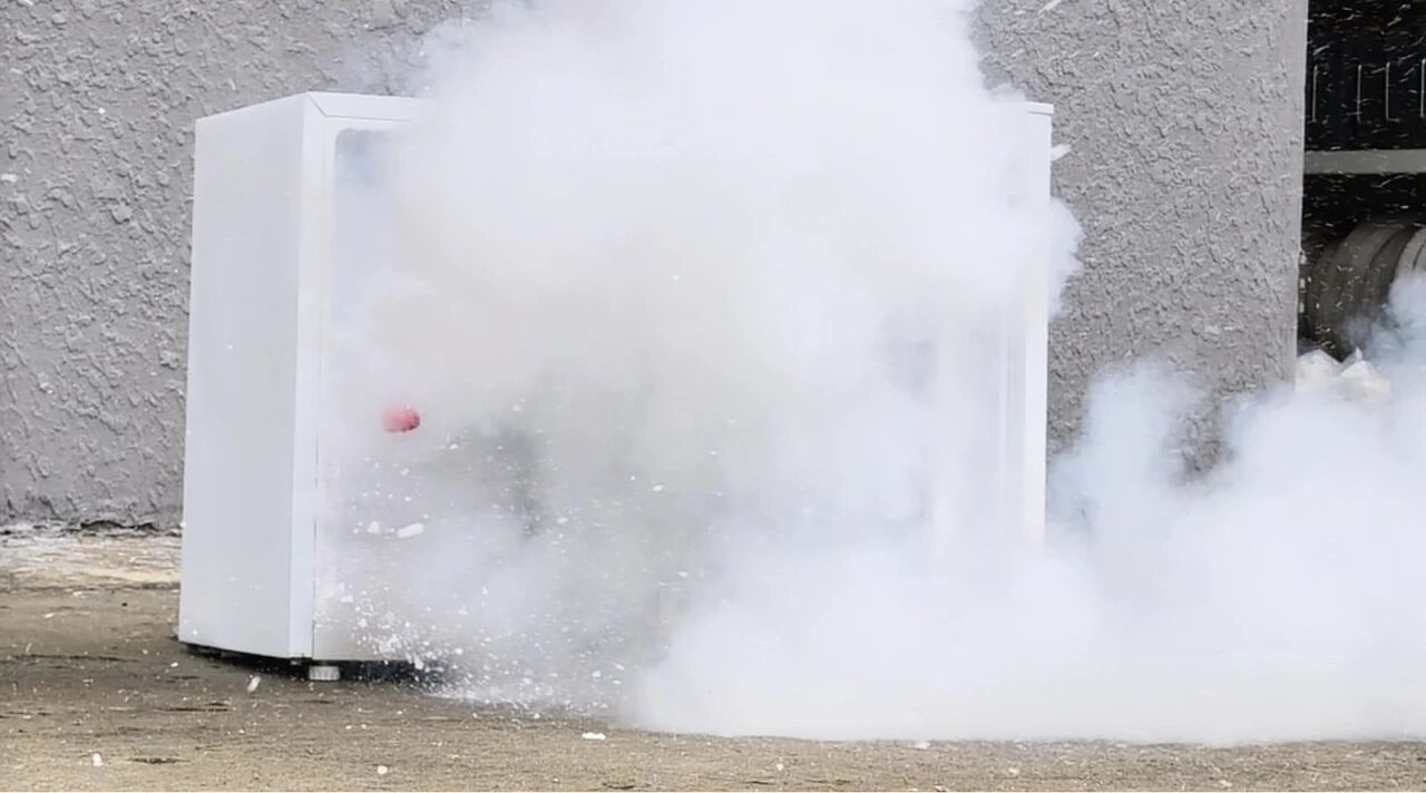 随后,救火员再次用冰箱做测试,将拆有干冰和水的矿泉水瓶放入冰箱一段时间后,冰箱门也被庞大的冲击力顶开。
